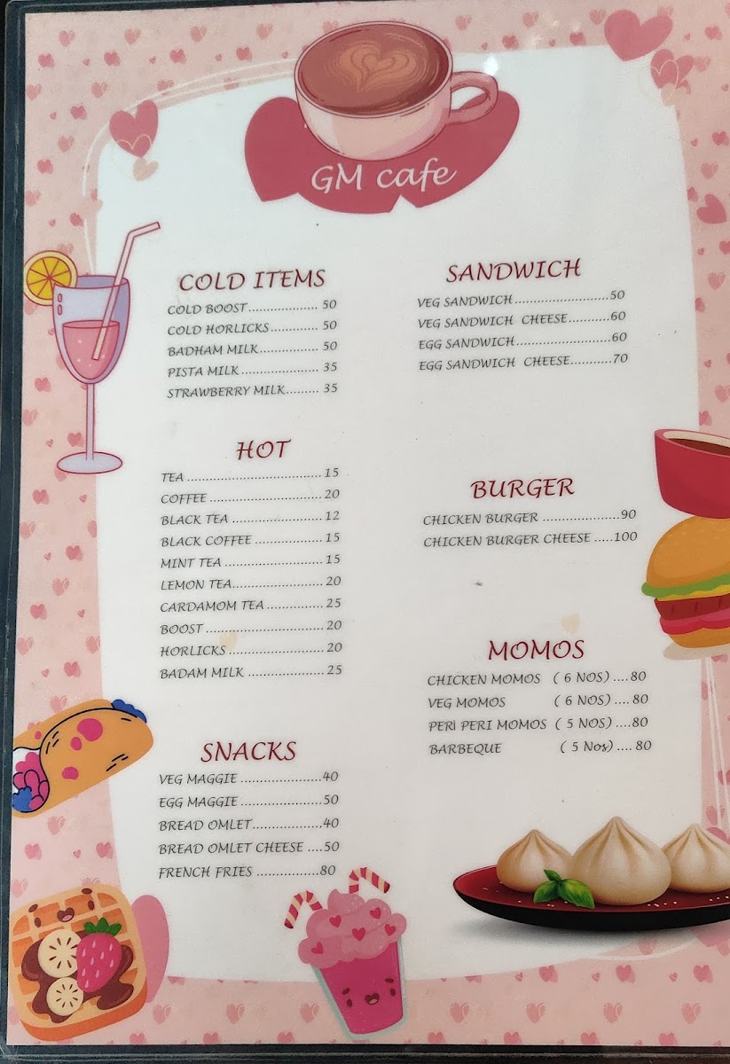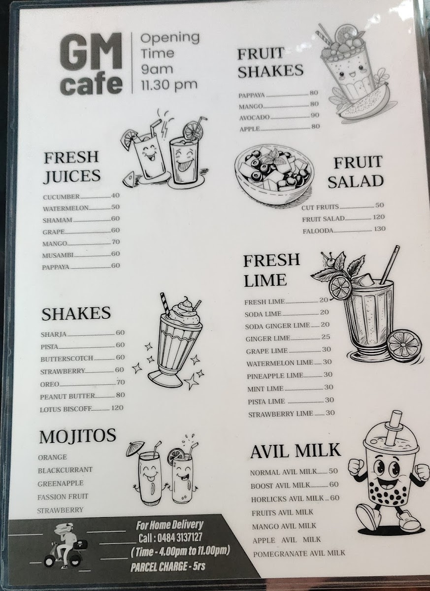 The menu at GM Cafe is a delightful array of flavorful options. Guests can choose from a selection of fruit shakes, featuring refreshing and healthy flavors like Papaya, Mango, and Avocado, priced from ₹80 to ₹90. Additionally, the fresh lime drinks offer invigorating variations such as Ginger Lime and Watermelon Lime, ranging from ₹20 to ₹30.